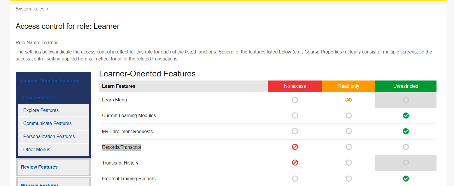 The Records/Transcript function may not appear for users if the feature is disabled in the Learner system role settings.